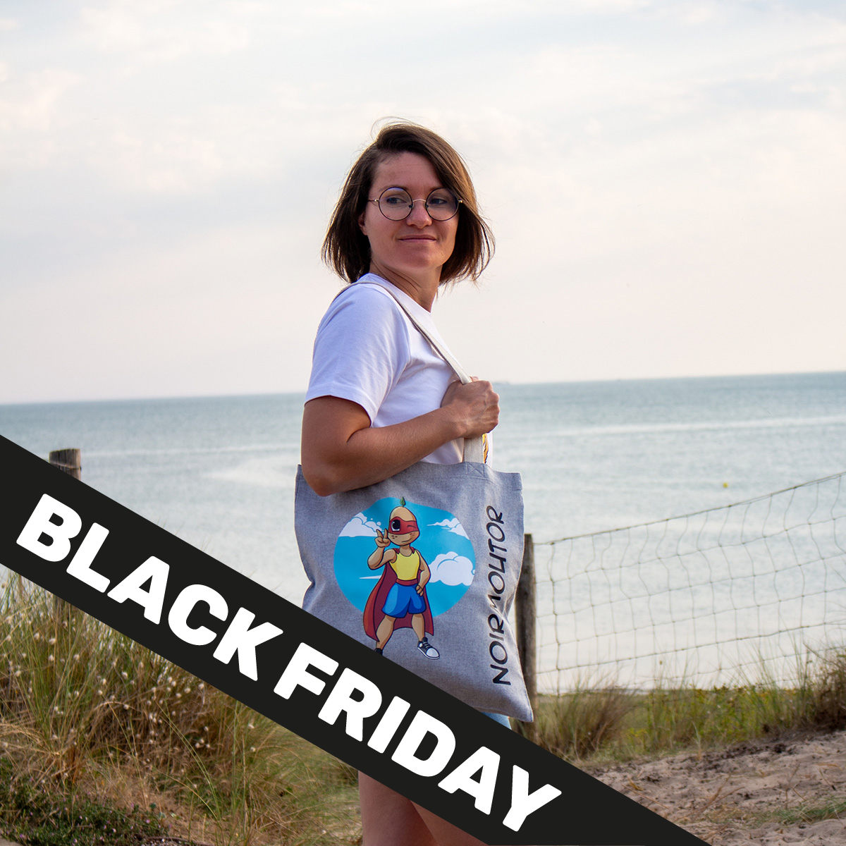 Sac shopping plat en coton et polyester recyclés, avec une illustration de Noirmoutor faisant un geste de la main.
